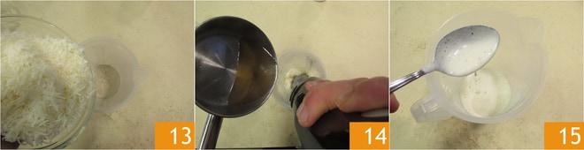Versez le pecorino râpé dans un récipient 13 et ajoutez l'eau désormais tiède 14, mixez avec un mixeur plongeant pour obtenir une sauce lisse 15.
