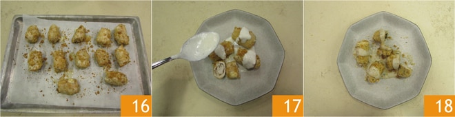 Une fois cuites les bombettes de poulet cacio e pepe 16, sortez-les du four et servez-les bien chaudes avec la sauce au pecorino 17 18.