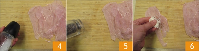 Prenez une tranche de poulet, salez 4 et poivrez des deux côtés 5. Garnissez le centre avec environ 5 g de pecorino et une pincée d'origan 6.