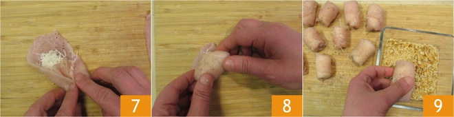 Repliez les bords latéraux vers l'intérieur 7 et enroulez la tranche pour créer le roulé 8. Avec ces quantités, vous en obtiendrez 12. Passez les roulés dans les taralli émiettés 9.