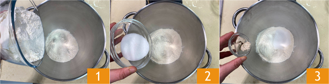Pour préparer la pâte des bombolonis, versez dans un batteur muni d'un crochet la farine 00 et la Manitoba 1, le sucre 2 et la levure de bière fraîche émiettée 3.