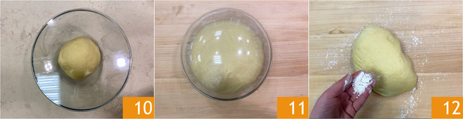 Placez la pâte dans un bol, couvrez de film plastique et laissez lever à une température de 26°-28° pendant environ 3 heures et demie 10 ou jusqu'à ce qu'elle ait triplé de volume 11. Une fois le temps de levée écoulé, reprenez la pâte et transférez-la sur une surface légèrement farinée 12.