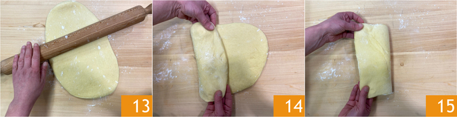 Étalez-la légèrement avec un rouleau à pâtisserie pour former un rectangle d'environ 2 cm d'épaisseur 13. Pliez vers l'intérieur l'un des côtés les plus courts 14, celui de gauche, en le ramenant vers le centre de manière à ce qu'en pliant également l'autre côté, celui-ci soit à ras avec le premier pli 15.