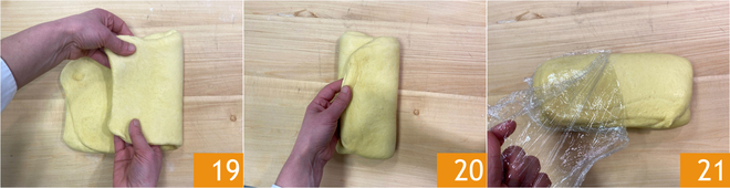 Procédez avec 2 autres pliages en commençant par le bord droit 19 puis celui de gauche 20. Laissez reposer la pâte obtenue 21 pendant encore 10 minutes, en veillant à la couvrir d'un film plastique et d'un torchon. Répétez encore une fois les 2 pliages et le repos de 10 minutes (pour un total de 3 fois).