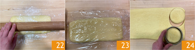 À la fin du temps de repos, étalez la pâte sur la surface de travail avec le rouleau à pâtisserie jusqu'à une épaisseur d'environ 1,2 cm 22. Couvrez de film plastique et laissez reposer pendant 10 minutes avant de découper la pâte car si vous la coupez immédiatement elle a tendance à se rétracter 23. À l'aide d'un emporte-pièce d'un diamètre de 8,5 cm, découpez des disques de pâte 24 : vous en obtiendrez 10 (vous pouvez également utiliser le bord d'un verre pour la coupe).