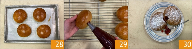 Faites cuire dans un four statique préchauffé à 175 ° pour 20-25 minutes. Ensuite, sortez les bombolonis 28 et laissez-les tiédir. Une fois refroidis, transférez la confiture dans une poche à douille munie d'une douille lisse et garnissez les bombolonis 29. Saupoudrez de sucre glace et servez vos délicieux bombolonis au four 30!