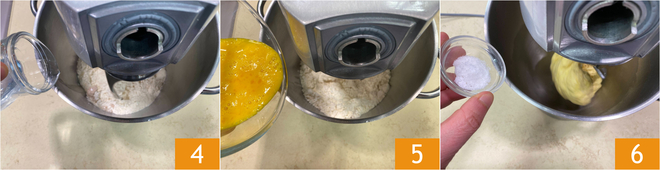 Démarrez le batteur et versez l'eau en filet 4, puis ajoutez les œufs battus peu à peu 5. Lorsque la pâte sera bien liée, ajoutez le sel 6. Laissez le batteur à vitesse moyenne pendant environ 3-4 minutes.
