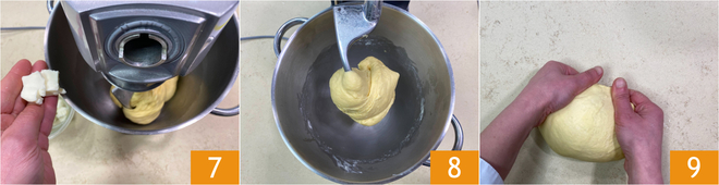 Lorsque la pâte se détache des bords du bol, incorporez le beurre ramolli, petit morceau par petit morceau 7, en attendant qu'il soit absorbé avant d'en ajouter davantage. Une fois tout le beurre absorbé, travaillez encore la pâte pendant environ 10 minutes, jusqu'à obtenir une consistance lisse et compacte 8. Transférez la pâte sur un plan de travail, pliez-la quelques fois et formez une boule 9.