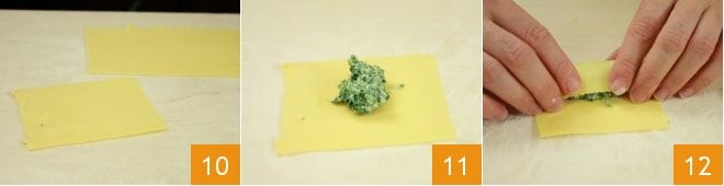 Étalez la pâte à œufs en une feuille très fine, que vous découperez en rectangles de 10x8 cm 10. Au centre de chaque rectangle de pâte, déposez une petite cuillère de farce 11 et roulez la feuille sur elle-même du côté le plus long 12.