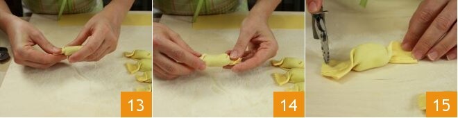 Maintenant façonnez vos bonbons : tournez le bord droit dans le sens des aiguilles d'une montre 13 et le bord gauche dans le sens inverse des aiguilles d'une montre, comme pour refermer le papier d'un bonbon 14. Coupez les bords extérieurs des deux côtés avec une roulette dentelée 15.