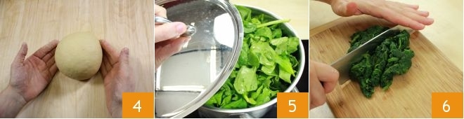 Une fois prête, donnez-lui une forme sphérique 4, enveloppez-la dans un film plastique et laissez reposer dans un endroit frais avec une lumière allumée pendant environ 30 minutes. Passez à la préparation de la farce : faites cuire les épinards dans très peu d'eau salée 5 ou faites-les cuire à la vapeur ou simplement sauter à feu doux dans une poêle antiadhésive. Puis égouttez-les et hachez-les finement 6. Une fois cuits et bien égouttés, les épinards pèseront environ 100 g.