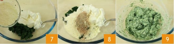 Mettez les épinards hachés dans un bol auquel vous ajouterez la ricotta et le Grana Padano DOP râpé 7, la noix de muscade, le sel et le poivre 8. Mélangez tous les ingrédients jusqu'à obtenir un mélange doux mais compact 9.