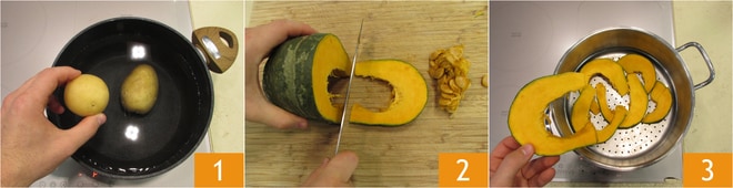 Pour préparer les Bouchées de potiron, ricotta et speck, commencez par les pommes de terre, mettez-les dans une casserole remplie d'eau 1, allumez le feu et à partir de l'ébullition, comptez environ 30/40 minutes. En attendant, retirez les graines du potiron, coupez des tranches fines d'1 cm d'épaisseur 2 et placez-les dans un cuit-vapeur 3. Placez ce dernier sur la casserole avec les pommes de terre et faites cuire environ 20-25 minutes : faites le test à la fourchette pour être sûr.