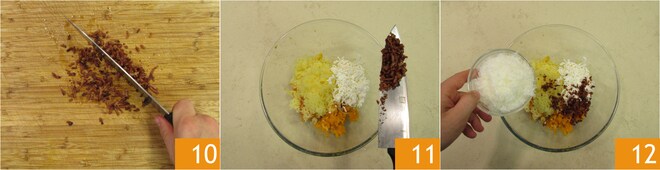 Hachez le speck au couteau 10. À ce stade, toujours avec le presse-purée, affinez la ricotta dans le bol avec le potiron et les pommes de terre, ajoutez les miettes de speck 11 et le pecorino râpé 12.