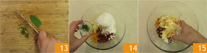 Hachez également la sauge au couteau 13, ajoutez-la dans le bol 14 avec du sel, du poivre et la cannelle en poudre. Pétrissez le mélange à la main 15, il deviendra compact mais un peu mou.