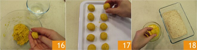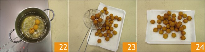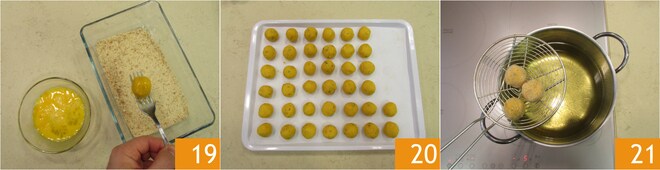 Humidifiez vos mains et formez des bouchées d'environ 15 grammes chacune 16, de cette façon vous obtiendrez une quarantaine de pièces. Disposez-les au fur et à mesure sur un plateau recouvert de papier sulfurisé et laissez reposer au réfrigérateur pendant une heure 17. Une fois le temps écoulé, chauffez l'huile à 160/170° et passez les bouchées d'abord dans les œufs battus 18
