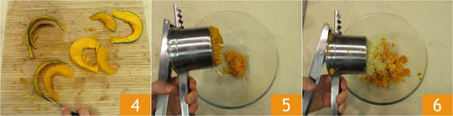 Retirez la peau du potiron 4 et écrasez-le avec un presse-purée 5, récupérez également les pommes de terre et écrasez-les de la même manière 6. Laissez tiédir.