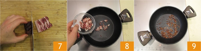 En attendant, retirez la couenne du speck, s'il y en a, tranchez-le finement à quelques mm d'épaisseur 7 puis découpez des petites lanières. Faites-les revenir à feu vif dans une poêle antiadhésive 8 jusqu'à ce qu'elles soient dorées 9.