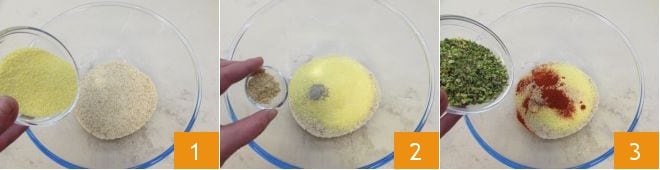 Pour préparer les bouchées de saumon épicé croustillantes, commencez par réaliser la panure. Versez la chapelure et la farine de maïs dans un bol 1 ; puis ajoutez le poivre blanc moulu, la moutarde en poudre 2, le paprika et les pistaches concassées 3.