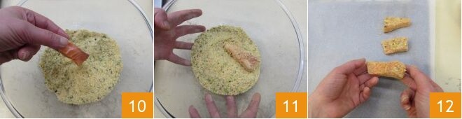 Placez chaque bouchée de saumon dans le bol avec la panure 10, puis retournez-la pour l'enrober de tous les côtés 11. Disposez les triangles sur une plaque de cuisson recouverte de papier sulfurisé 12
