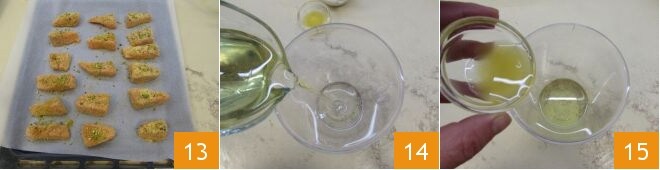 et continuez de cette manière jusqu'à épuisement des morceaux 13. Enfournez dans un four statique préchauffé à 180° pendant 8-10 minutes (si vous utilisez un four ventilé, cuisez à 160° pendant environ 6 minutes). Pendant que le saumon cuit, préparez la fausse mayonnaise. Versez l'huile de graines dans le verre d'un mixeur plongeant 14 et ajoutez le jus d'orange filtré 15.