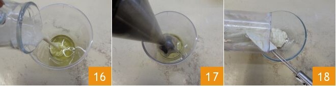 Ajoutez le lait de soja 16 et mixez le tout avec un mixeur plongeant 17 jusqu'à obtenir une mayonnaise crémeuse, puis transférez-la dans un petit bol 18.
