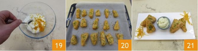 Ajoutez le zeste d'orange et mélangez pour bien amalgamer le tout. Une fois vos bouchées de saumon épicé et croustillant sorties du four 20, servez-les bien chaudes accompagnées de la fausse mayonnaise à l'orange 21.