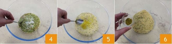 Ajoutez le sel 4 et mélangez le tout. Ajoutez le zeste de citron finement râpé 5 et le curry 6. Mélangez de nouveau et réservez.