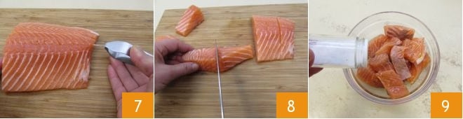 Prenez le filet de saumon, retirez les arêtes éventuelles 7 et enlevez la peau si elle est présente. Coupez-le en tranches d'environ 3 cm de large, puis divisez chaque tranche en deux 8, de manière à obtenir des triangles. Une fois toutes les bouchées terminées, transférez-les dans un petit bol et assaisonnez-les avec du sel 9, de l'huile et du poivre. Mélangez pour bien amalgamer les ingrédients et faire en sorte que chaque morceau de saumon soit bien enrobé d'huile, afin de permettre à la panure d'adhérer parfaitement.