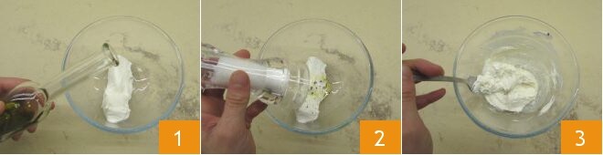Pour préparer les bouchées feuilletées au fromage et miel, commencez par assaisonner le fromage de chèvre avec un filet d'huile 1, du sel 2 et du poivre, puis mélangez pour obtenir une crème homogène 3.