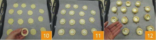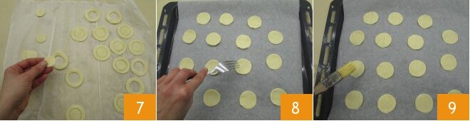 puis retirez la partie centrale pour obtenir des anneaux d'une largeur de 1 cm 7. À ce stade, piquez les disques que vous avez placés sur la plaque avec une fourchette 8 et badigeonnez-les du mélange de lait et de jaune d'œuf que vous aurez préalablement battu ensemble 9.
