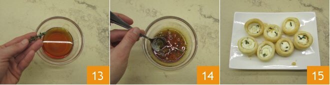 Enfin, versez le miel de châtaignier dans un petit bol, ajoutez le thym effeuillé 13 et mélangez bien 14. Garnissez vos bouchées feuilletées au fromage et miel avec le miel au thym et servez-les avec le petit bol à côté 15 !