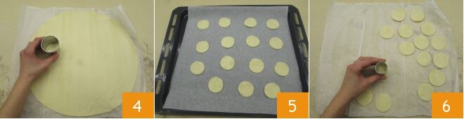 Déroulez la pâte feuilletée sur le plan de travail et découpez 40 disques avec un emporte-pièce de 3,5 cm de diamètre 4, puis transférez 20 de ces disques sur une plaque recouverte de papier sulfurisé 5. Découpez les disques restants avec un emporte-pièce plus petit, de 2,5 cm de diamètre 6,
