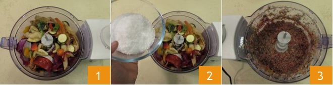 Pour préparer le bouillon de légumes, prenez tous les restes de vos légumes 1. Vous pouvez utiliser n'importe quel type et n'importe quelle partie comestible de chaque légume. Vous devrez obtenir un total de 760 grammes de restes entre épluchures, extrémités des légumes, découpes, etc. Transférez-les ensuite dans le récipient d'un mixeur 1, ajoutez le gros sel 2 et mixez le tout jusqu'à obtenir une purée 3.