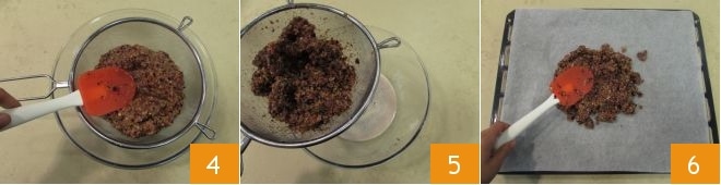 Puis placez une passoire sur un bol et transférez le mélange à l'intérieur, pressez avec une cuillère 4 pour éliminer l'excès d'eau 5. Disposez ensuite une feuille de papier sulfurisé sur une plaque et transférez le mélange de légumes dessus 6.