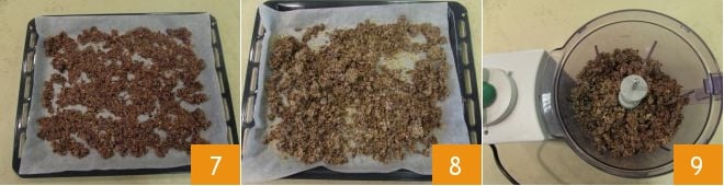 Étalez-le sur la plaque, en l'étalant uniformément 10 et faites cuire dans un four statique préchauffé à 120°C pendant environ 2 heures et demie. Lorsque les légumes seront bien secs, sortez-les du four 11, laissez-les refroidir et transférez-les à nouveau dans le mixeur propre 12.