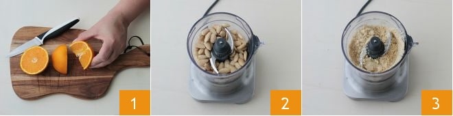 Pour réaliser les boules aux amandes et à l'orange, commencez par laver l'orange et prélevez-en un quart 1. Pendant ce temps, placez les amandes émondées dans un mixeur 2 et mixez-les jusqu'à les réduire en poudre 3 en actionnant le mixeur par impulsions, afin de ne pas trop chauffer les amandes.
