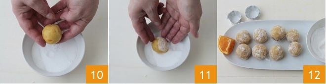 À ce stade, passez chaque boule dans le sucre 10 de manière à ce que le sucre adhère bien sur toute la surface 11. Au fur et à mesure que vous formez les boules, disposez-les sur un plateau et si vous le souhaitez, placez-les dans de jolies caissettes colorées, laissez reposer les boules aux amandes et à l'orange 2-3 heures à température ambiante avant de les servir 12 !