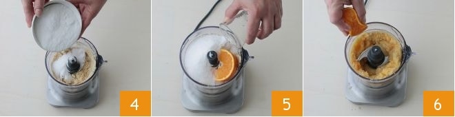 Ajoutez le sucre 4, le quartier d'orange et la liqueur 5, donnez un autre tour de lames pour amalgamer le mélange et si cela semble trop sec, ajoutez un peu plus de jus d'orange 6.