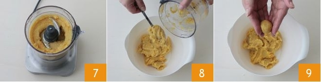 Une fois que la pâte est prête 7, transférez-la dans un bol plus grand 8 et avec les mains humides, prélevez environ 30-35 g de pâte et formez des boules de la taille d'une noix 9.