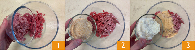Pour préparer les boulettes avec cheddar et bacon, mettez dans un bol la viande hachée de bœuf et de porc 1, puis ajoutez la chapelure 2 et le Parmigiano Reggiano râpé 3.