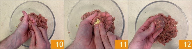 Prélevez environ 40 g de pâte et formez une boule dans la paume de la main 10, puis insérez des cubes de cheddar au centre 11 et refermez pour recréer une forme ronde 12. Continuez ainsi pour former toutes les boulettes ; avec ces quantités, vous en obtiendrez environ 18.
