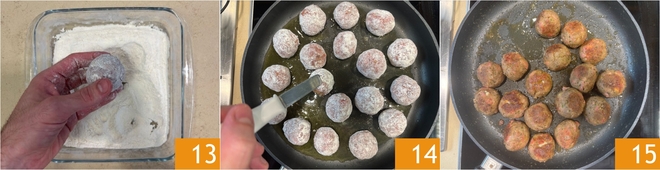 Faites passer les boulettes dans la farine 13, puis faites-les dorer dans une poêle avec l'huile chaude pendant environ 7 minutes, en les tournant des deux côtés 14 15.
