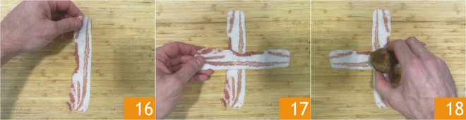 À ce stade, placez une première tranche de bacon sur une planche à découper 16 et une autre en travers pour former une croix 17, puis placez au centre une boulette dorée 18.