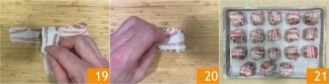 Repliez les tranches de bacon sur la boulette 19 de manière à l'envelopper complètement 20. Disposez au fur et à mesure les boulettes enveloppées dans le bacon sur une plaque recouverte de papier cuisson 21.