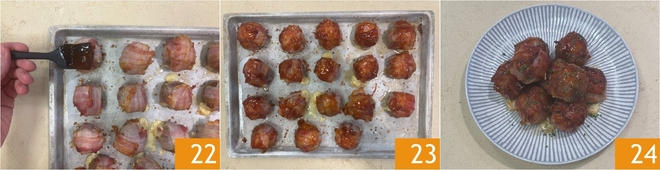Faites cuire dans un four statique préchauffé à 230° pendant 10 minutes. Lorsqu'elles sont bien dorées, sortez les boulettes du four et badigeonnez-les de sauce barbecue 22, puis remettez-les au four pendant 1 à 2 minutes 23. Garnissez avec de la ciboulette hachée et servez immédiatement vos boulettes avec cheddar et bacon 24 !