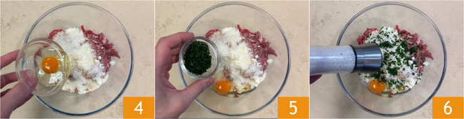 Ajoutez également l'œuf 4, le persil finement haché 5, le sel 6 et le poivre.