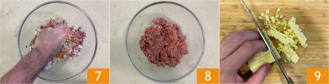 Pétrissez à la main pour amalgamer les ingrédients 7 et obtenir un mélange homogène 8. Maintenant, réduisez le cheddar en petits cubes 9.