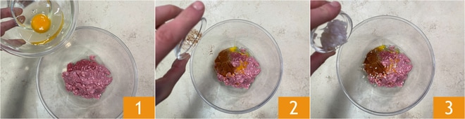 Pour préparer les boulettes avec crème de cannellini, versez dans un bol la viande hachée de bœuf et de porc, puis ajoutez l'œuf 1, les épices 2, l'échalote et l'ail hachés 3.