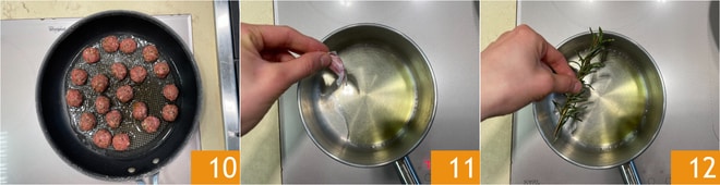 Faites cuire les boulettes 10 jusqu'à ce qu'elles soient dorées, en les retournant de temps en temps, cela prendra environ 10 minutes. Préparez entre-temps la crème de cannellini : dans une casserole, chauffez un filet d'huile avec l'ail écrasé en chemise 11 et le romarin 12.